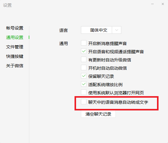 功能設置方面,可以設定將聊天中的語音消息自動轉為文字(默認關閉),可以設定收到的文件是否自動下載(默認開啟),建議后一項設為關閉,以節省本地電腦空間,此時收到的文件旁邊會出現一個下載標記,點擊才會存到本地。