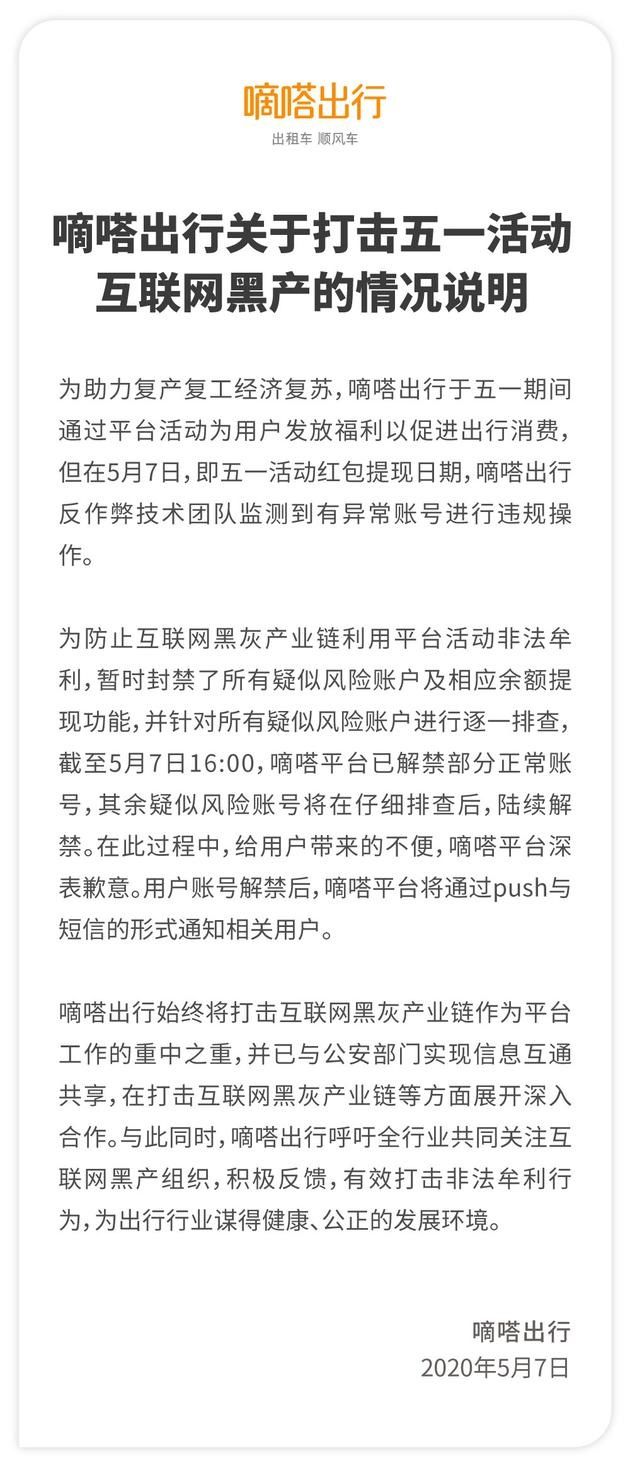 了解到,嘀嗒出行指出,為防止互聯(lián)網(wǎng)黑灰產(chǎn)業(yè)鏈利用平臺(tái)活動(dòng)非法牟利,暫時(shí)封禁了所有疑似風(fēng)險(xiǎn)賬戶及相應(yīng)余額提現(xiàn)功能,并針對(duì)所有疑似風(fēng)險(xiǎn)賬戶進(jìn)行逐一排查,截至5月7日16:00,嘀嗒平臺(tái)已解禁部分正常賬號(hào),其余疑似風(fēng)險(xiǎn)賬號(hào)將在仔細(xì)排查后,陸續(xù)解禁。