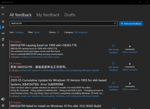 之前微軟針對(duì)version 1909、1903版本(目前Win10中最穩(wěn)定版本),發(fā)布了KB4556799補(bǔ)丁(版本號(hào)Build 18363.836),設(shè)計(jì)多項(xiàng)改進(jìn)和安全修復(fù)程序,不過(guò)很多用戶升級(jí)后發(fā)現(xiàn),這個(gè)補(bǔ)丁翻車了。