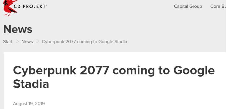 在 CD Projekt Red 在去年 8 月發(fā)布的一份聲明中,官方曾宣布 Cyberpunk 2077 將于 2020 年在谷歌云游戲平臺 Stadia 發(fā)布。