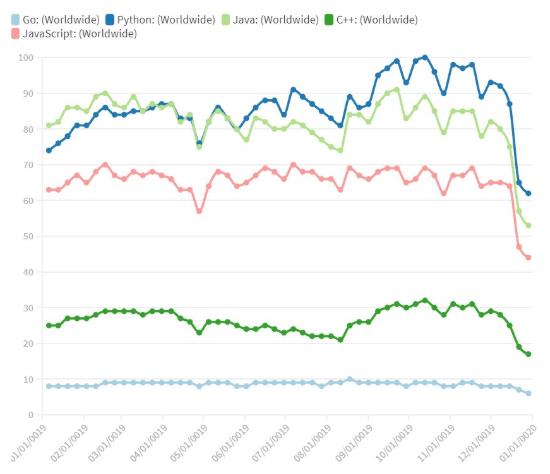 根據 GitHut 2.0 給出的統計信息,Python 和 Go 都在 2019 年的前五大語言中占有一席之地。于是,Imperva 公司又將目光聚焦到了 GitHub 上的網絡安全項目。GitHub 雖然未對存儲庫進行直接分類,但 Security 主題下擁有超過 8,500 個與安全相關的庫,而這些庫中的主要語言分別為:長期排在第一位的 Python,其次是 Java、JavaScript 和 PHP,最后是 Go。前四位毫不令人意外,而 Go 是在 2019 年首次取代了基于 Shell 的代碼,進入 top 榜。