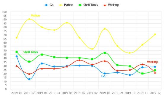 按工具來分類,Python 依舊是大多數黑客的首選武器,緊接著是使用量增長迅速的 Go 語言;再其次是 WinHttp 庫,該庫主要由 Windows 上運行的 .net 和 CPP 使用;Shell 工具(如 cURL、wget 等)也榜上有名。瀏覽器也是常用的攻擊工具。