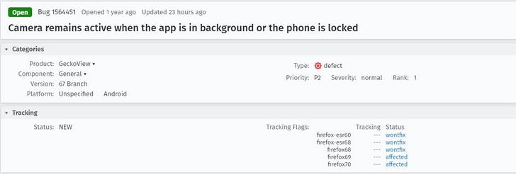 Mozilla 近期在修復 Android 版 Firefox 上的一個 bug,該 bug 導致用戶切換應用程序或鎖定手機屏幕后,攝像頭仍處于活動狀態。