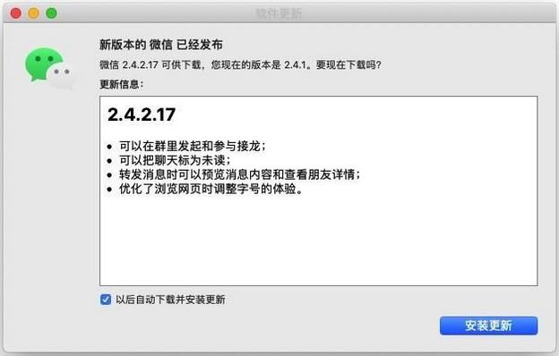 騰訊 macOS 版微信迎來了 2.4.2.17 版本更新,可以把聊天標(biāo)為未讀;轉(zhuǎn)發(fā)消息時可以預(yù)覽消息內(nèi)容和查看朋友詳情;優(yōu)化了瀏覽網(wǎng)頁時調(diào)整字號的體驗。