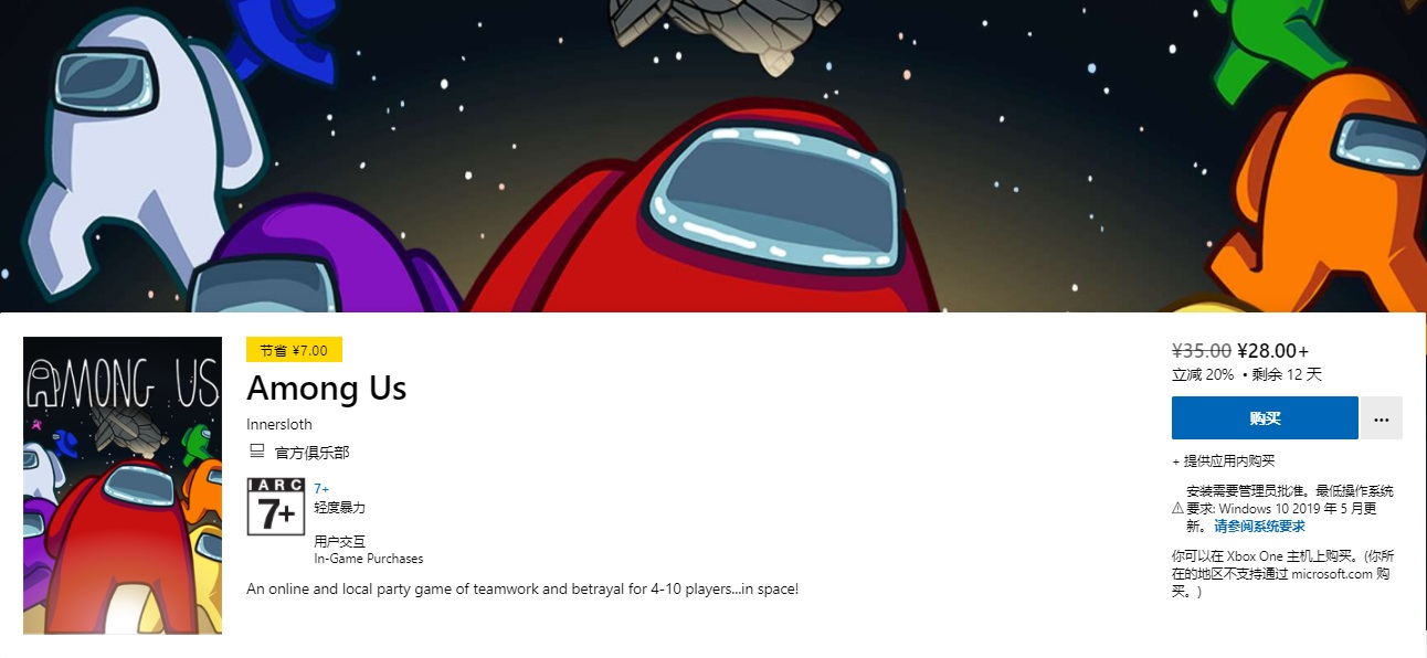 最近熱銷的策略休閑游戲《Among Us》已經上線微軟應用商店,限時售價 28 元。