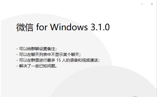 微信近期發(fā)布了 Windows 微信 3.1.0 測試版,帶來了幾個新的功能。本次Windows 微信 3.1.0 測試版更新新增群聊設(shè)置備注,聊天列表中不顯示某個聊天,群里進行最多 15 人的語音和視頻通話功能,還解決了一些已知問題。