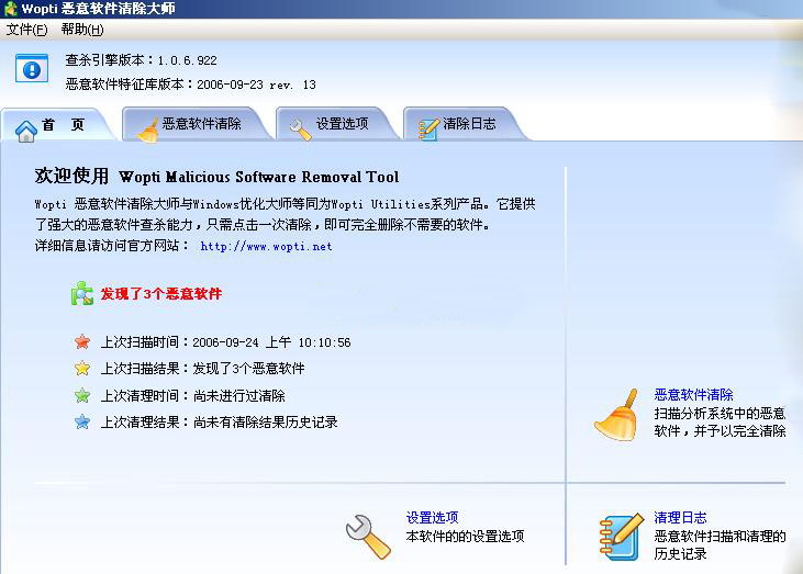全新的免費工具Wopti 惡意軟件清除大師,幫助用戶快速掃描和清除自己系統中的惡意軟件。 1、掃描徹底。獨有的Wopti掃描引擎,徹底掃描分析用戶系統上存在的惡意軟件以及使用普通查殺工具清除不完全造成的惡意軟件歷史痕跡。 2、一次性完全清除。獨有的Wopti動態驅動清除內核,一次性徹底清除惡意軟件,無需多次運行查殺工具。避免了同類產品刪除不完全或需多次清除的弊病。 3、報告詳盡。詳盡準確的掃描和清除報告,讓用戶對自己的操作了如指掌。 4、實時更新。惡意軟件特征庫實時更新(一周數次)。