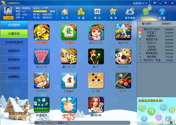 云海游戲云海游戲是“云南人自己的游戲”,史上第一款為本地人量身定做的網絡棋牌游戲,在云海游戲您不僅可以享受到網絡游戲的快樂,還可以結交到更多的本地好友!比賽最公平、最好玩、最刺激的游戲盡在云海棋牌游戲。