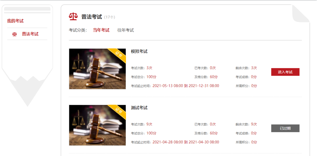 點擊學員首頁“進入考試”圖標或者點擊導航進入到考試列表頁面,該頁顯示為所有考試列表,包括每場考試的考試次數、已考次數、剩余次數、考試總分、及格分數、考試成績、考試起止時間、所需積分。有考試行業標簽,以及是否獲得證書。
