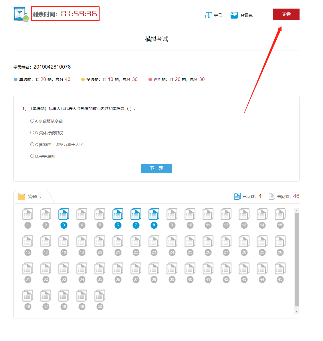 點擊“交卷”按鈕時,如果有未做完的題目,會彈出提示:“還有XX題未做,是否交卷”,您可選擇繼續答題或確定交卷。確定交卷后,平臺會即時彈出考試成績,會顯示您的考試是否合格。