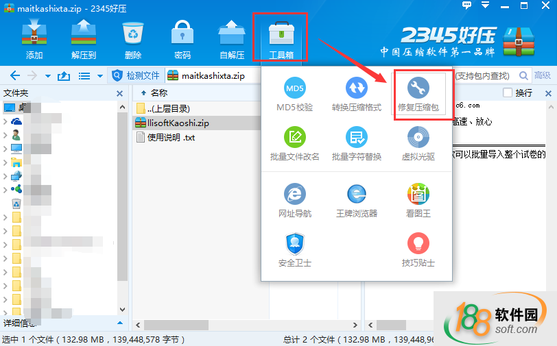 2、在好壓頁面中點擊需要修復的文件,然后點擊【工具箱】,選擇【修復壓縮包】;
