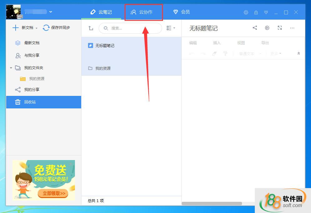 2、在進入到云筆記的主界面后,我們點擊云協作功能選項。