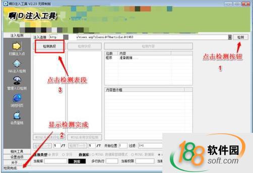 5、雙擊一條可用注入鏈接,界面自動跳轉到“SQL注入檢測”