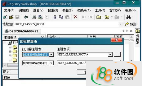 2.Registry Workshop中提供了一個較同類軟件中沒有的功能,名為"比較注冊表",顧名思義,該項功能可以將用戶所選擇的一對注冊表進行比較然后經過分析后將相同項和其他等信息顯示在軟件下方的對話框中。