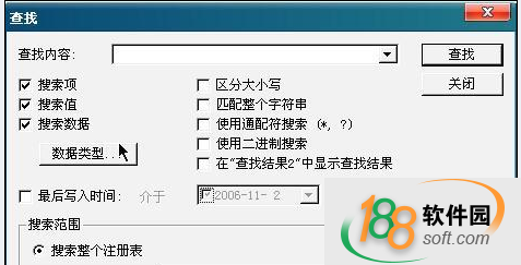 查找功能較為全面,其中的一些查詢細則也是比較詳細的,可以按照項、值、數據,進行查找,也可以按照一些鍵值屬性進行查找,同時還提供了查找的時間范圍以及搜索文件范圍,搜索速度較快。