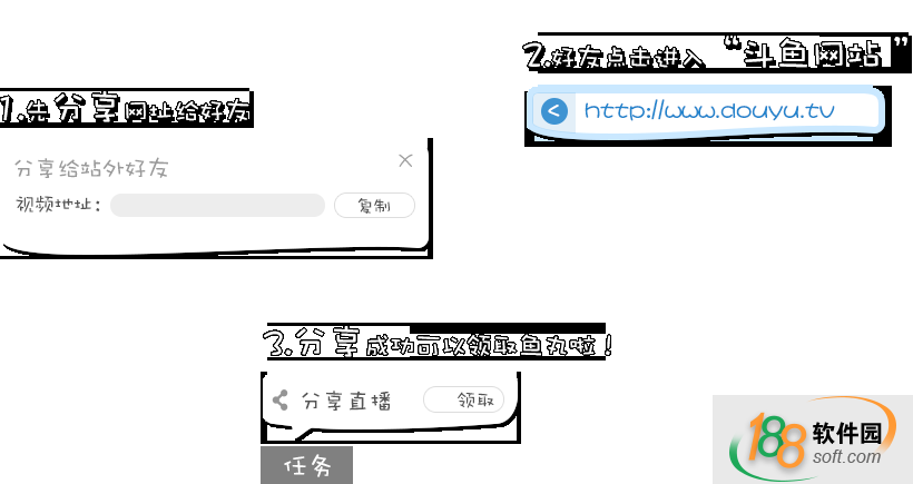 分享:1、先分享視頻地址給好友,2、好友點擊進入“斗魚網(wǎng)站”3、分享成功可以領取魚丸啦!您每邀請一個好友進入就可以獲得10個魚丸哦(每個好友只記一次哦)