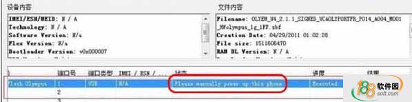 5、稍等片刻,約為10-20分鐘,當(dāng)RSDLite刷機(jī)工具提示“Pleasemanuallypowerupthisphone”的時(shí)候表示SBF底包文件已經(jīng)刷好。