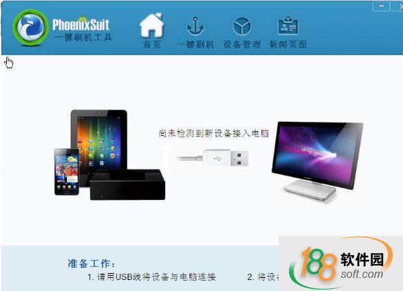 運行PhoenixSuit 程序時默認進入的第一個模塊,也可以通過點擊按鈕 進入主頁界面。
