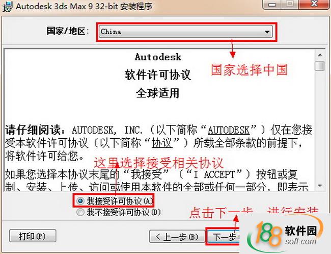 在協議界面中,最上面的國家我們選擇china(中國),然后選擇同意接受相關協意(我接受相關許可協議),再次點擊下一步進入安裝。