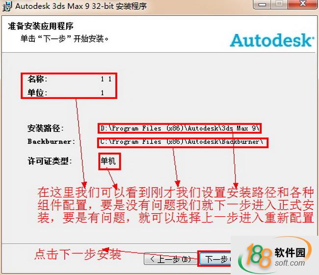在這個這個界面我們可以看到我們之前所配置以及3dmax9.0 32位中文版的安裝路徑。認真檢查一次,發現要修改的地方,可以點擊上一步進行修改,要是沒有錯誤就點擊下一步正試進入安裝。