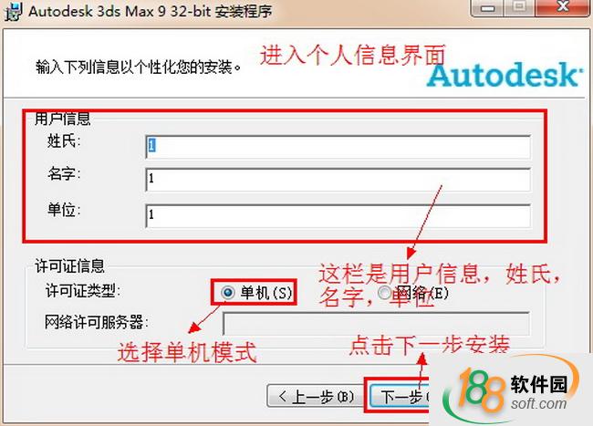 5、進入個人安裝信息界面,繼續安裝3dmax9.0 32位 中文版