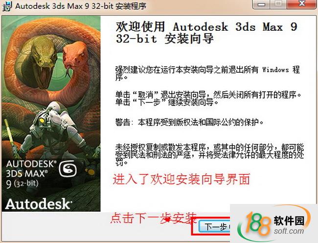 雙擊安裝程序后(3dsmax9_win32)進入了安裝向導界面,點擊進入下一步安裝。