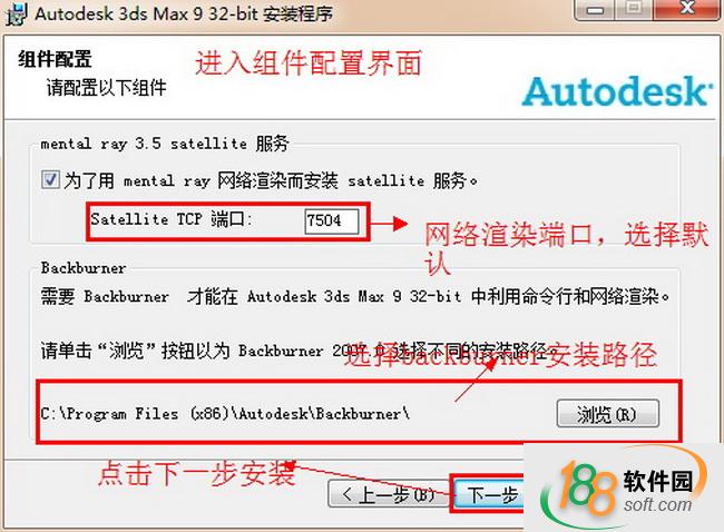 配置完成3dmax9.0 32位 中文版安裝路徑后,我們進入了組件配置界面,在這個界面里我們可以看到網絡渲染和backburner這兩框:網絡渲染端口(7504)我們選擇默認,backburner安裝路徑我們也保持默認,點擊下一步安裝。