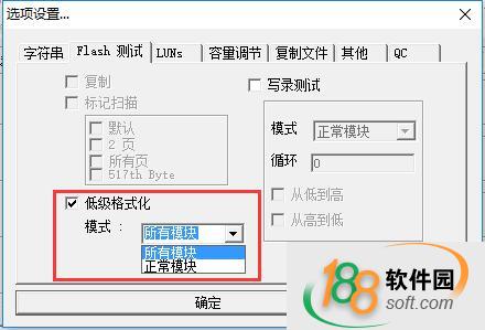 (4)請選擇“Flash測試”,選擇“低級格式化”;這里有兩個參數(shù),一個是“所有模塊” (它的意思是低格式化整個盤),另一個是“正常模塊” (它的意思是只低格式化好的區(qū)塊,這個參數(shù)適合于含有壞區(qū)的U盤)
