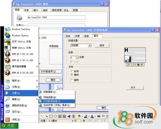 2、其他軟件請參照步驟1相同位置選擇即可,或者直接從電腦(操作系統為win2000/winXP)的開始中選擇設置,再選擇打印機和傳真,鼠標左鍵單擊后,出現打印機屬性,然后鼠標單擊常規下的打印首選項,選擇基本中的橫向即可,win98和winMe方法雷同.(如下圖)