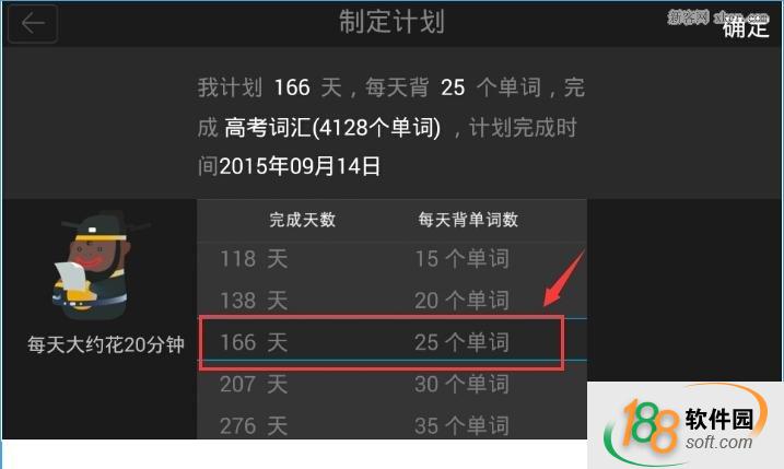 3、制定你打算你的學習計劃,如多少天,每天背多少個單詞等,選擇好后點擊確定即可;