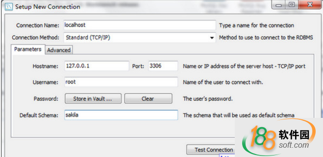 * 使用MySQL Workbench的SQL Development的 new connection來創建鏈接localhost,鏈接到先前導入的數據庫實例sakila,如下: