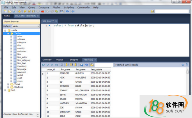 * 在MySQL Workbench的SQL Development的環境中查詢數據庫實例sakila的actor表內容,如下: