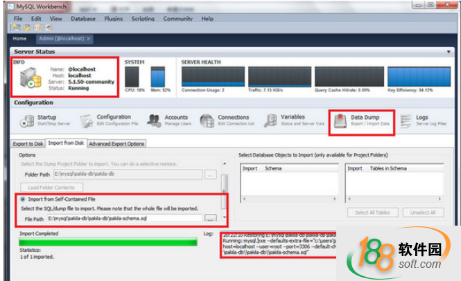 * 同時也可以使用MySQL Workbench的Server Administration的Data Dump來導出數據庫,導出有兩種格式,第一為導出到dump project folder,每個表為一個sql文件,第二種為導出為self contained file,所有的表導出為一個sql文件;