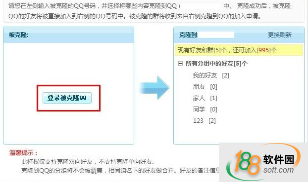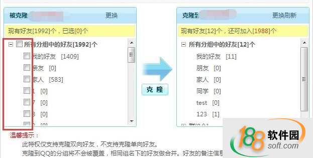第三步:在被克隆QQ里選擇想要克隆的內容:您可以自由選擇要克隆的內容,可以單獨克隆某個群或者某個好友分組,只需在頁面左邊被克隆號碼中勾上要克隆的內容即可。