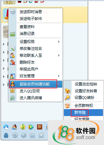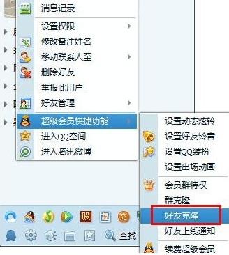 在QQ客戶端上,右擊任意一個好友,在彈出框中點擊“會員快捷功能--好友克隆”進入,如下圖:
