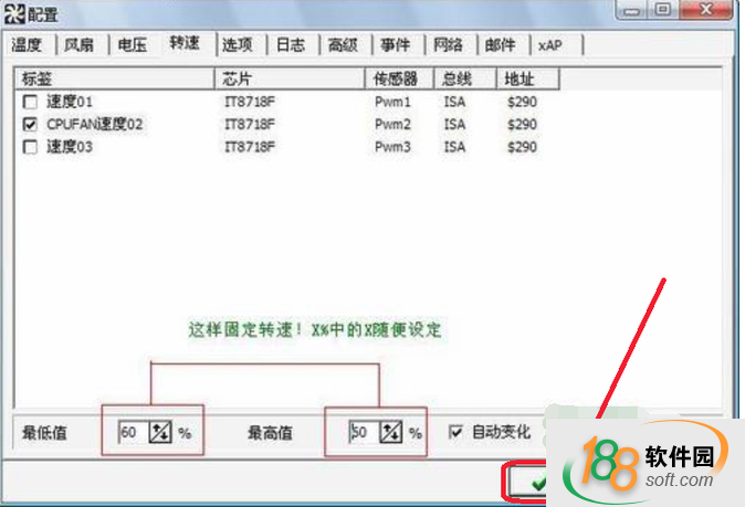 關于這個問題,主要是速度最高值是多少,SpeedFan開機的初始值就是多少,一般最高值是100%,然后開機時再根據CPU的溫度會自動從100%調節轉速。如果大家想把速度固定在60%,如圖: