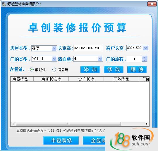 卓創家裝報價預算軟件是一款專為的裝修報價軟件。卓創家裝報價預算軟件使用方法簡單,輸入實際面積,裝修類型,就可以直接獲得相關的裝修報價了。188軟件園為您提供卓創家裝報價預算軟件官方版下載,歡迎有需要的小伙伴前來下載。