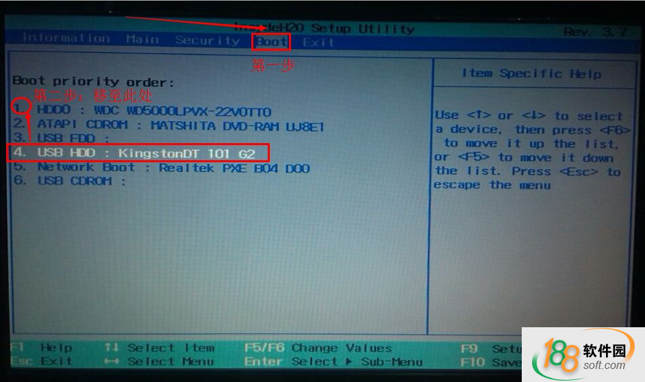 首先,將u盤啟動盤插入到電腦usb插口中,隨后打開電腦,出現開機畫面后按熱鍵進入bios設置(bios熱鍵不同品牌的機子有可能不同,大家自行網上查閱。)然后使用鍵盤上的左右方向鍵“←,→”將光標移至Boot 菜單,再使用鍵盤上的上下方向鍵“↑,↓”將光標移至USB HDD : KingstonDT 101 G2, 使用F5/F6鍵將u盤移動到第一啟動項,最后按F10保存退出