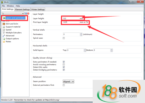 2、選擇“Print Settings”下的“Layers and...”,這里建議將每層的高度設置為0.2MM,并且首層的高度為0.35MM