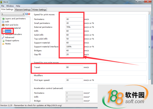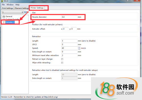 5、選擇“Prenter”進行擠出頭的直徑設置0.4MM。其它的可以按照自己的需要設置。