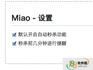 1. 點(diǎn)擊瀏覽器Miao插件圖標(biāo),彈出層里點(diǎn)擊“設(shè)置默認(rèn)啟動(dòng)秒殺”鏈接(默認(rèn)開啟)