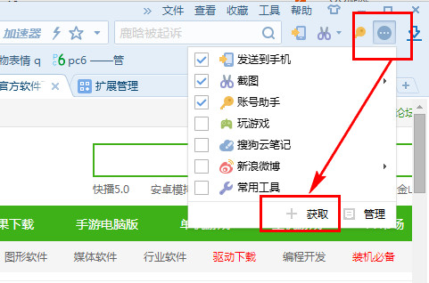 1、打開搜狗瀏覽器點擊更多擴展,點擊獲取
