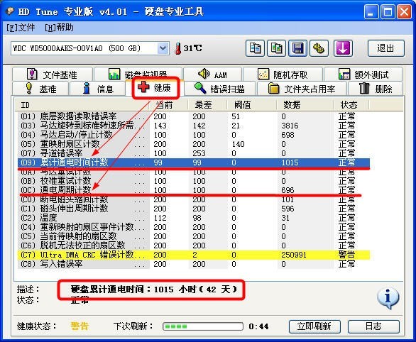 答:運行HD Tune Pro,選中“健康”卡如下顯示硬盤通電時間、次數。