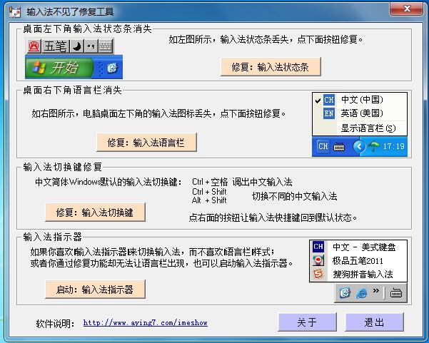 此輸入法修復工具免費的,此輸入法設置工具軟件會自動幫你找回你不見的輸入法圖標和修復默認的輸入法切換鍵。