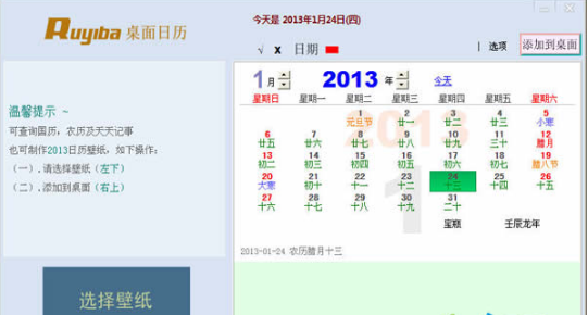Ruyiba桌面日歷方便查詢國(guó)歷,農(nóng)歷,星座及記事功能。也可將日歷半透明的鑲在任意你所喜愛(ài)的桌面背景圖象上,制作成2013日歷壁紙,簡(jiǎn)單二步驟不占用電腦資源及內(nèi)存。免費(fèi)軟件,無(wú)需安裝。