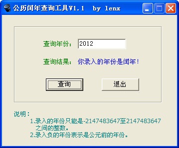 公歷閏年查詢工具在“查詢年份”框中錄入需要查詢的年份,然后點擊“查詢”按鈕,即可在“查詢結果”中看到查詢的結果。 更新日志