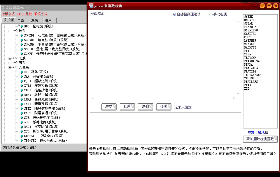 通達信未來函數檢測2013修改版,可以檢測目前5.03至以前4.0版本公式管理器中的公式指標是否帶未來函數。 使用說明 1、先運行本工具,再復制公式代碼即可在本工具界面自動提示公式是否含有未來函數