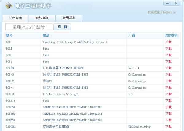 用于查找器件資料,方便器件封裝繪制。還能查找相關電路,查到所有電子元件,并提供下載PDF電路圖 功能介紹 1,免費查詢下載3000多萬種電子元器件資料,全球最全的元件庫。 2,免費查詢5萬多個電
