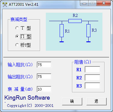 一個計算輸入與輸出阻抗的軟件,應用于天線設計吧,有三種接法,包含T型,橋型,以及π型!分別如下圖 用于計算電阻衰減,有常有的集中衰減電路的計算,輸入相應的輸入輸出阻抗和衰減率,即