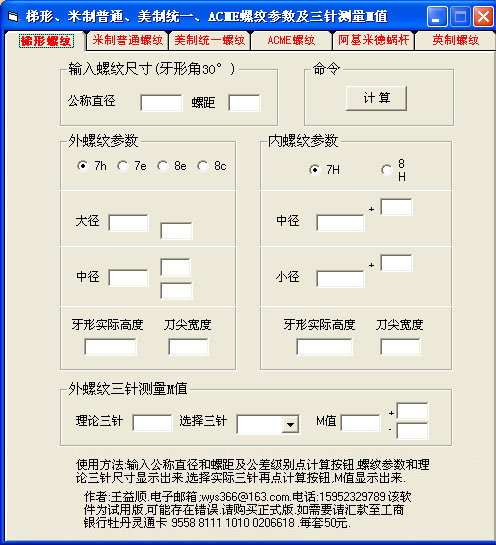 可以用來計算包括梯形螺紋、米制普通螺紋、美制統一螺紋、ACME螺紋、阿基米德蝸桿、英制螺紋 使用方法:輸入公稱直徑和螺距及公差級別點計算按鈕,螺紋參數和理論三針尺寸顯示出來,選擇實際三針再點計算按鈕,